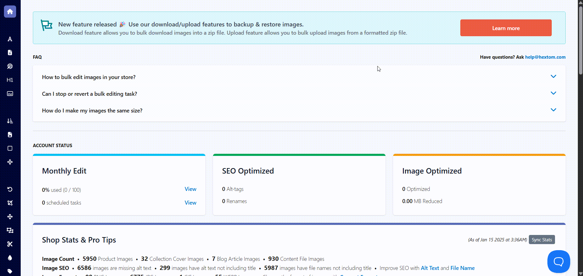 Bulk Image Edit allows you to quickly and efficiently upload, download and edit your product images, collection cover images, blog article cover images, and content file images. You can also edit image file name and alt text for SEO optimization.