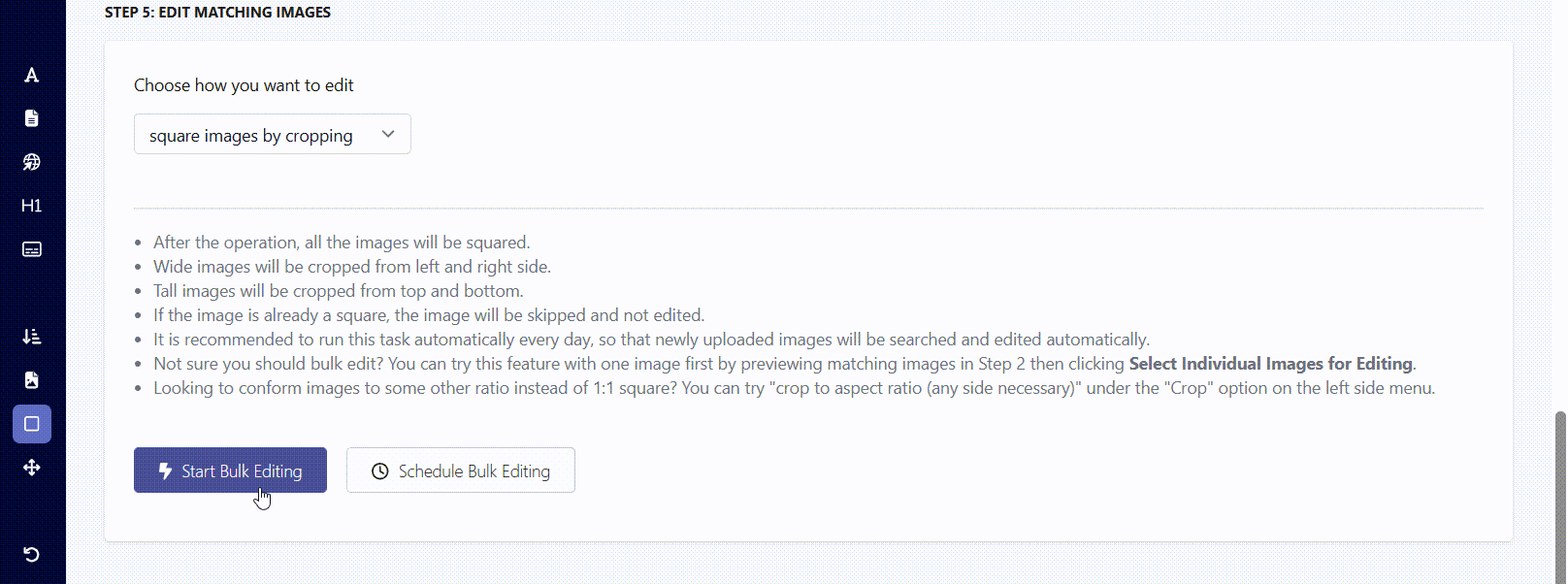 The next step would be to choose how you want to edit the product images. The options available will change depending on the field that you selected in Step 1. For example, in the GIF below, I am setting up a task to edit images into a 1:1 ratio.