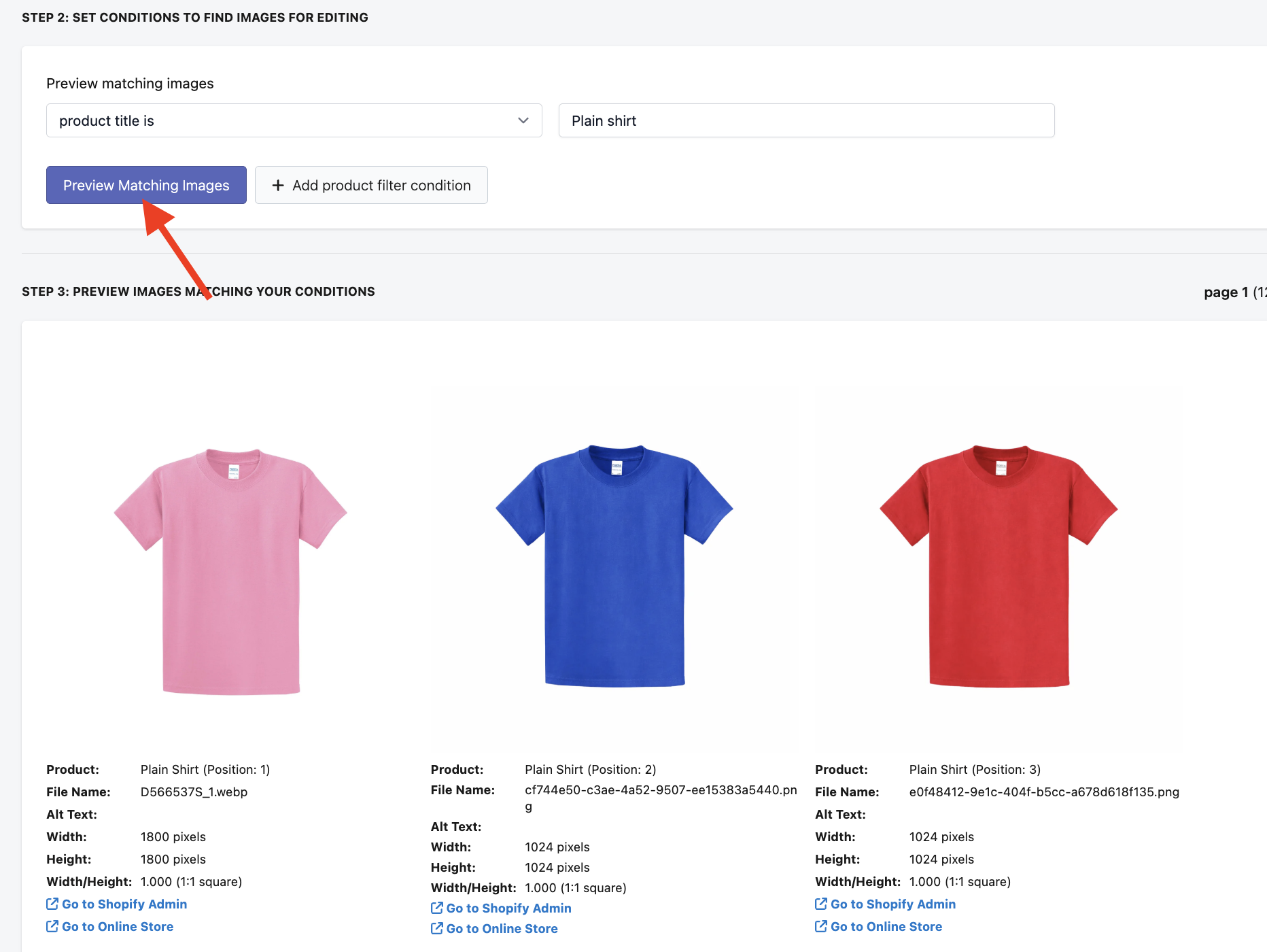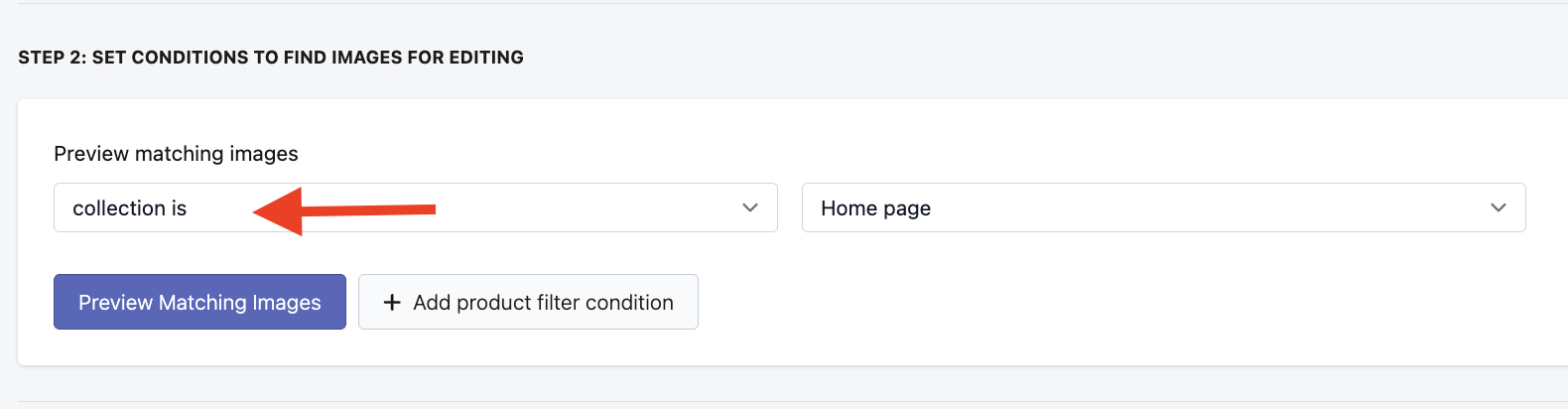Optional step: You can use additional filters to narrow down your filtered images and target specific images. For example, if you only want to edit the 1st image on each product, you would select "Image position of a product is 1st image (used as product cover)".