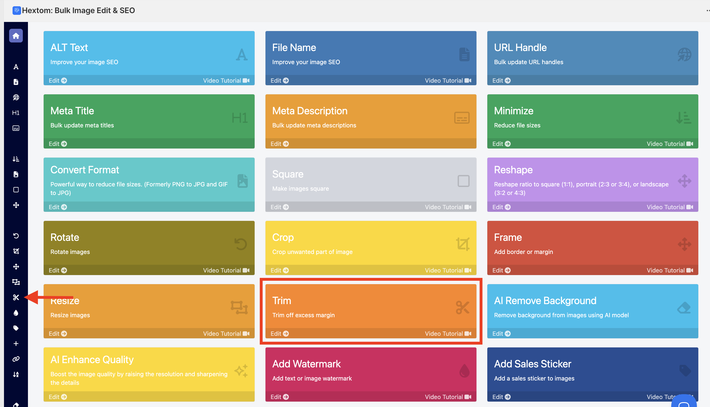 Open the Trim tool in the app's dashboard or by selecting it in the side bar.
