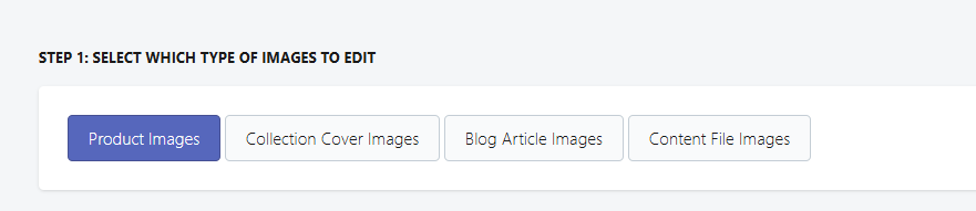 - On the Convert page, you need to select first which type of images you want to edit. You can choose from "Product Images" and "Content File Images". For our example below, we will edit "Product Images".