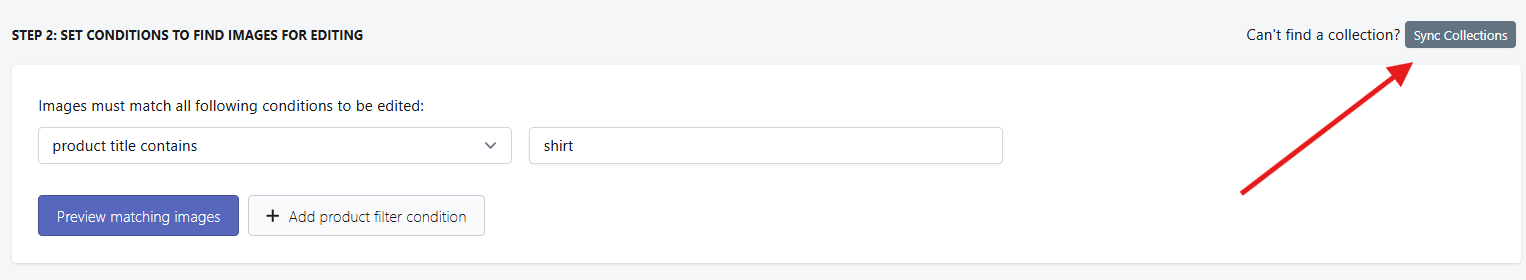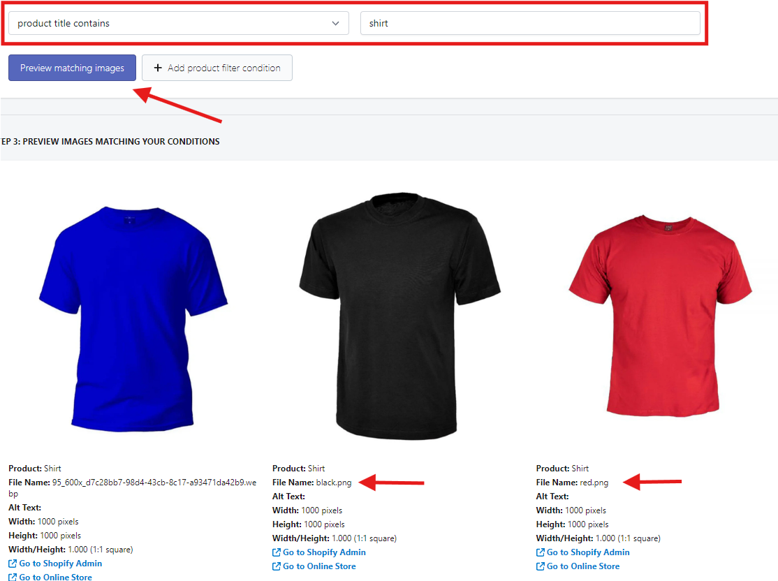 - On the second step, you need to set your condition for the product filter to find the images you want to edit. We will search for products that contain "shirt" in the title in this case. You may click the Preview matching images button to have a preview of the products that meet your criteria.
