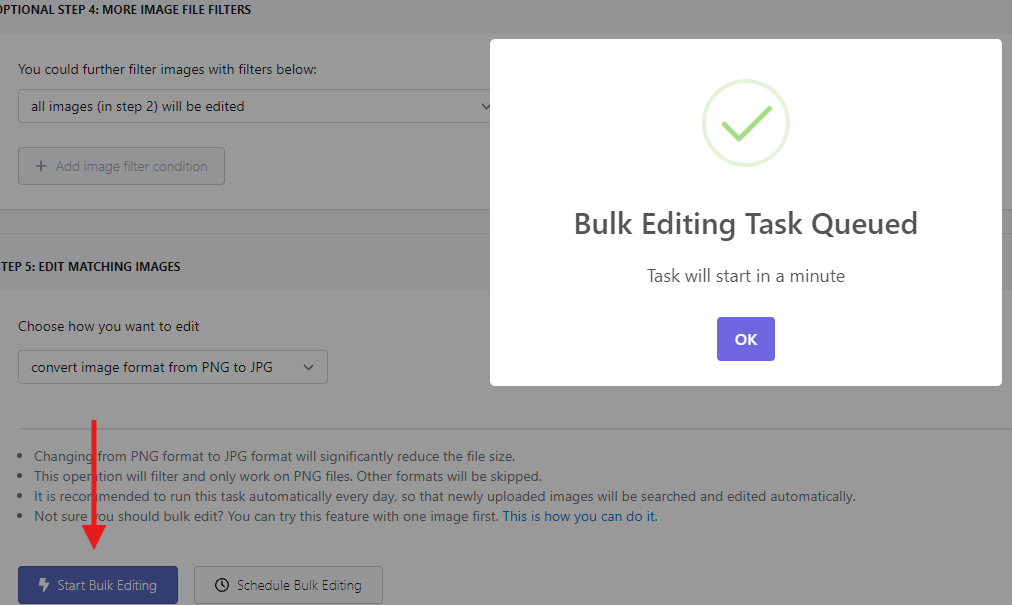 - After that, you can review everything and click on Start Bulk Editing to begin the image type conversion edit, and wait for the task to finish.