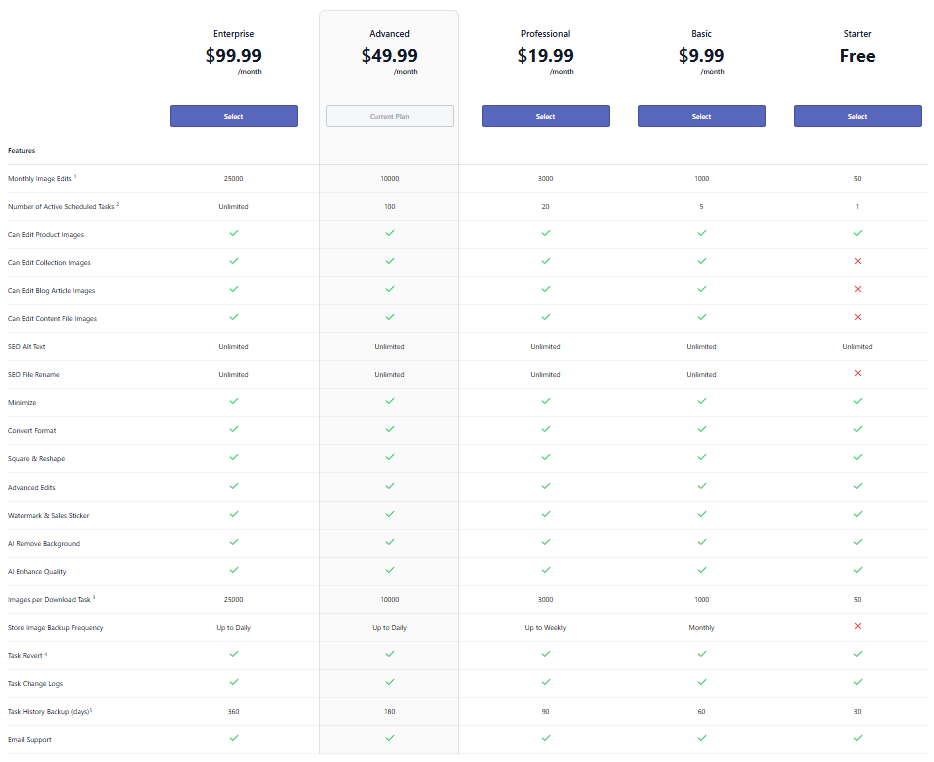 - Large stores or frequent bulk edits - The Advanced and Enterprise plan is ideal for stores with tens of thousands of images or ongoing bulk image optimization needs.