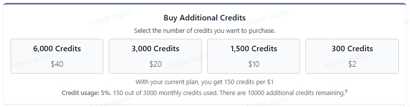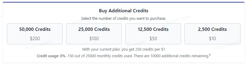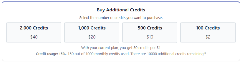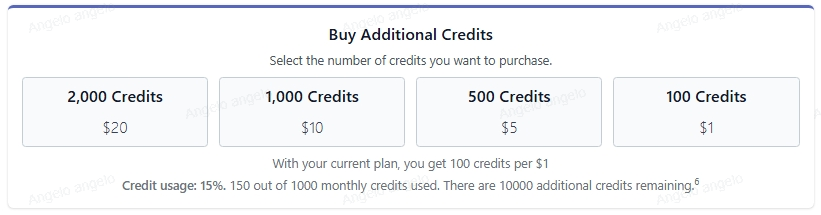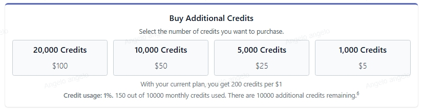 If you exceed your monthly credits, you can purchase additional credits at any time to continue editing without interruption. The prices and the number of credits available for purchase may vary depending on your plan. Below are the available options for extra credits for each plan: